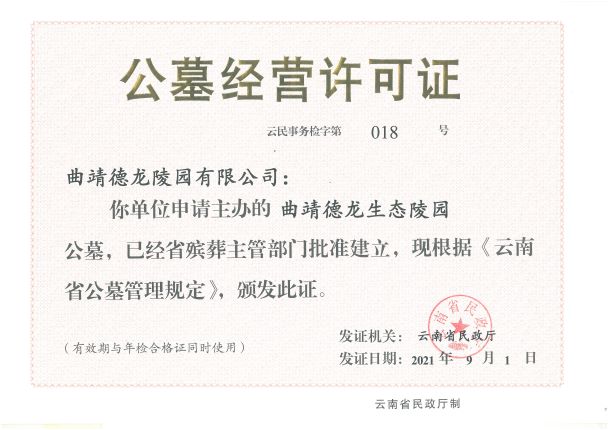 德龍園聚翠山之靈秀,依文脈而規(guī)劃,經(jīng)云南省民政廳批準建設(shè),規(guī)劃用地一共520畝,經(jīng)過精心設(shè)計,精細施工,于20219月取得《公墓經(jīng)營許可證》并投入使用。